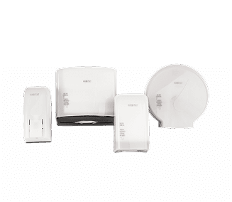 Mãos secas e limpas com dispensers elegantes e papéis e sabonetes de alta performance.